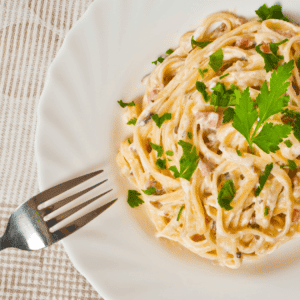 Toss Alfredo sauce with fettuccine pasta and add ½ cup of the parmesan cheese and toss the pasta.